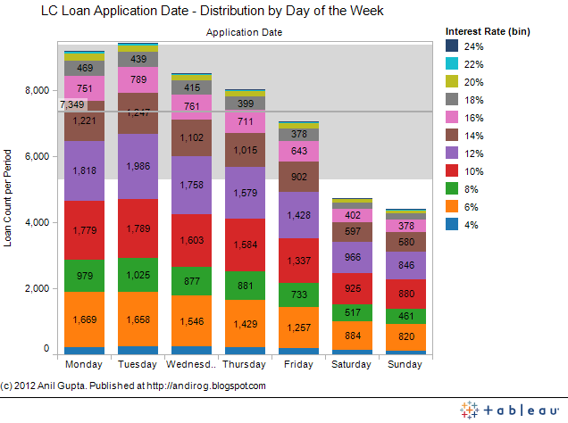 I assumed that the Loan Application Date, as the name implied, is the date when a borrower submits a loan application to Lending Club. This parameter may provide insights into the behavior of borrowers. But soon after I started reviewing Loan Application Date data in historical loans data file, I realized my assumption was wrong. The Loan Application Date is actually the Loan Listing Date on Lending Club platform when lenders can start buying notes in the loan.It was disappointing as my hypothesis was that using actual loan application date, I will be able to separate the two clusters of borrowers, ones who believe Lending Club is "one more" source of unsecured loan to borrow from versus the others who believe Lending Club to be "alternate" source of unsecured loan with attractive terms. I expect later to have lower default rate than the former.