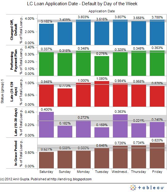 As discussed in my previous post Month-end Rush to Issue Loans at Lending Club, I noticed patterns of high volume and high default for the loans issued at the end of the month. Peter Renton mentioned in his comment that the rush to issue loans at the end of the month was due to LC Advisors making most investment in last few days of the month. He also mentioned that high loan origination flow recently has shifted to early in the month. As the year over year chart shows below, the volume of issued loans was definitely high at month-end for 2010 and 2011. In 2012, the loan origination volume seems to have shifted to first few days of the month.It is possible that LC Advisors was funding the remaining portion of loans at month-end that were partially funded by other lenders, and due to close relationship with Lending Club had shortened loan approval process. It is also possible that LC Advisors shifted to investing early in the month in 2012 after noticing higher defaults for loans issued at month-end. But I suspect that the spike in loan issued was not due to activities of LC Advisors solely. In my opinion, such actions will create serious doubts about integrity of Lending Club platform. Lending Club need to be more transparent around such potential conflict of interest scenarios.