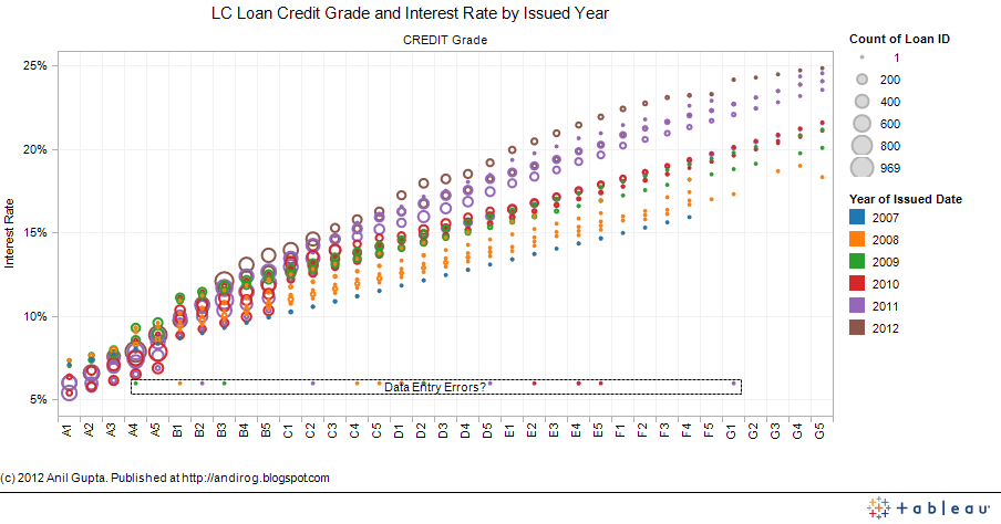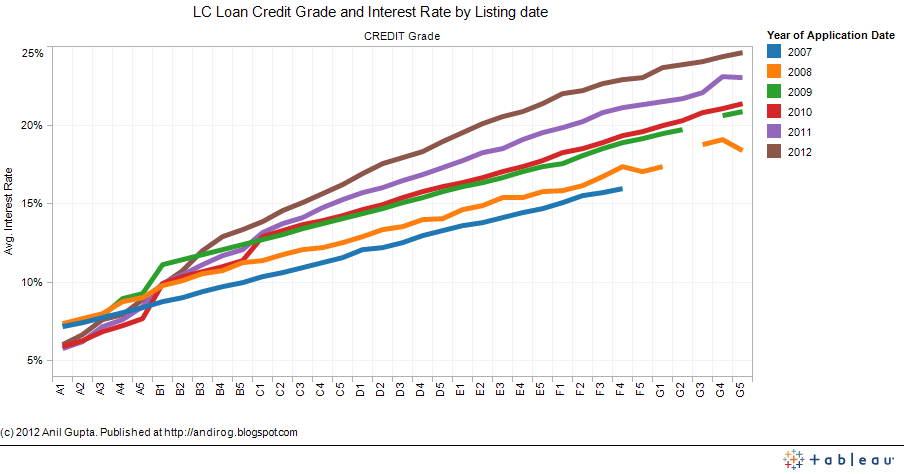 - From year 2007 through 2010, the Interest Rates for loans rose somewhat linearly with Credit Grades. Since 2011, the relationship between interest rates and credit grades have become curved, an indication of evolving default risk modeling with experience at Lending Club.