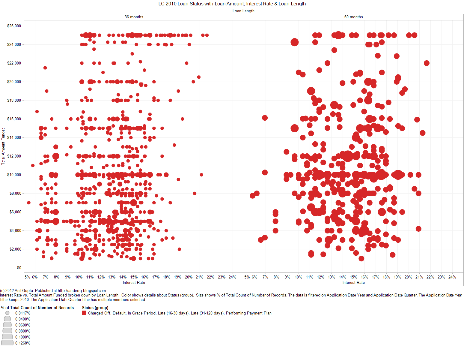 The chart below shows the percentage of loans with status of charged off, default, late, in grace period, and performing payment plan (size of red dot) for loans listed in 2010, the earliest year when 60 month loans were issued. I made the following observations:- In general compared to 36 month loans, higher percentage of 60 month loans have status of charged off, default, late, in grace period, and performing payment plan.