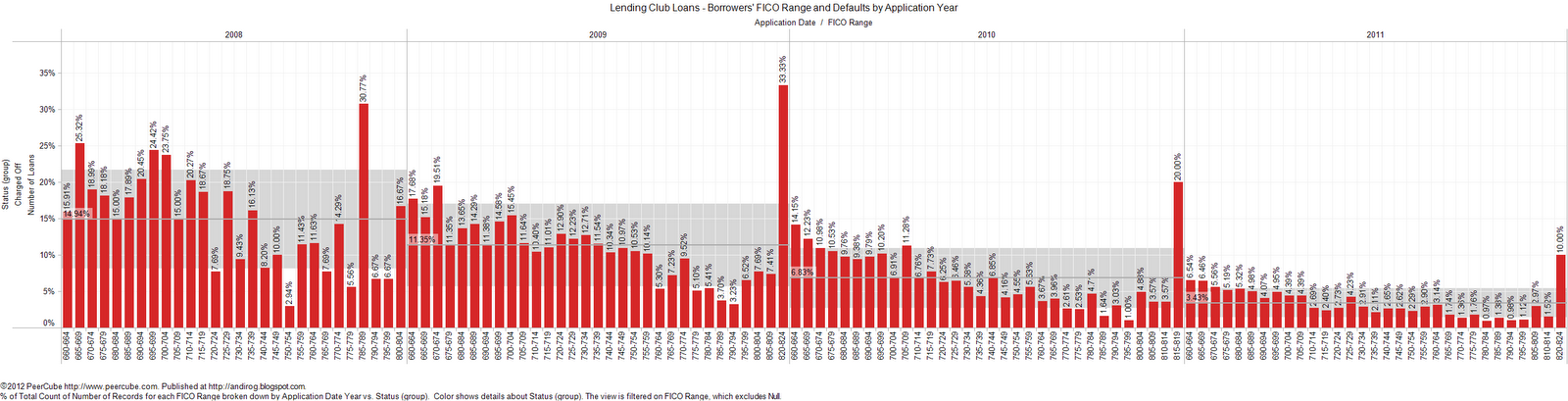 The chart below shows the loan status with borrowers' FICO score range for all loans issued since 2007. As expected, there is a clear trend of greater percentage of loans with charged off, default, and late status for borrowers with lower FICO score. Similarly, fewer borrowers with lower FICO score are likely to fully pay their loans.The chart below shows the loan status of charged off or default with borrowers' FICO score range for application year 2008 through 2011. The pattern of defaults with FICO range each year are very similar to aggregate results shown in the earlier chart. The default rate on loans issued to borrowers with FICO score of 670 and less can be considered exceptionally higher than what normally seen for other borrowers on Lending Club platform.