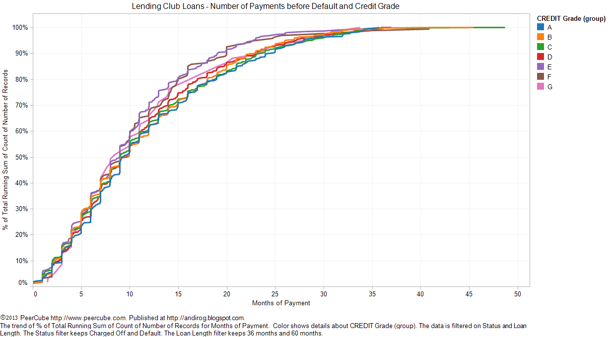 The chart below shows the percentage of defaulted loans as a function of number of monthly payments made for different Credit Grades.There doesn't appear to be any significant difference in default trend for loans with different credit grade. The separation of curves for Grade E, F, and G from rest of the pack at 15 months of payment and higher may suggest that greater number of such loans are defaulting earlier. Majority of E, F, and G grade loans are of 60 month term. As mentioned earlier none of the 60 month loans have reached full maturity yet. The separation in curve is most likely result of incomplete defaults data for 60 month loans to maturity.